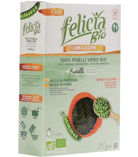 felicia Bio - 100% PISELLI VERDI BIO Fusilli RICCO DI PROTEINE RICCO DI FIBRE SENZA GLUTINE Prodotto innovativo; indicato per una alimentazione senza glutine, vegana, per chi ama prodotti biologici e per chi segue una dieta bilanciata. Il prodotto è ricco di fibre e proteine. Fonte di ferro. Compos… ...