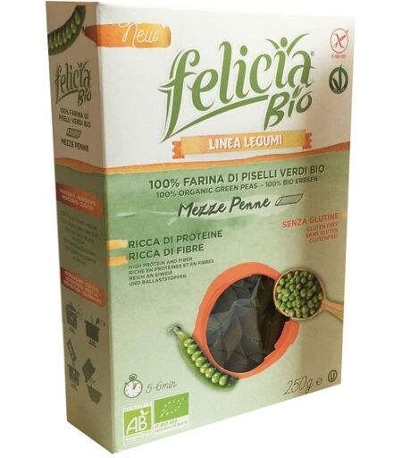 felicia Mezze Penne PISELLI VERDI BIO - Descrizione Pasta biologica e senza glutine, specificamente formulata per persone intolleranti al glutine. Ricca di proteine, di fibre e fonte di ferro. Ingredienti 100% Farina di piselli verdi bio. Senza glutine. Caratteristiche nutrizionali Valori nutrizion… ...