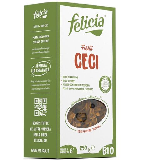 felicia Fusilli CECI BIO - Descrizione Pasta biologica e senza glutine, specificamente formulata per persone intolleranti al glutine. Ricca di proteine, di fibre e sali minerali come ferro, zinco, fosforo, manganese e potassio. Ingredienti 100% Farina di ceci bio. Senza glutine. Caratteristiche nut… ...