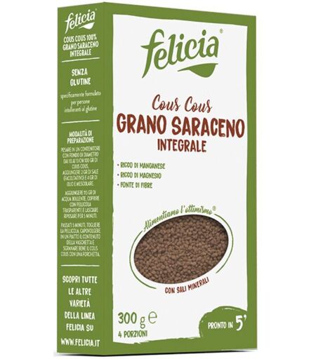 FELICIA - Cous Cous GRANO SARACENO - INTEGRALE - Descrizione Cous cous 100% grano saraceno integrale. Specificamente formulato per persone intolleranti al glutine. Ricco di manganese, magnesio e fonte di fibre. Ingredienti 100% farina di grano saraceno integrale. Senza glutine. Caratteristiche nutr… ...