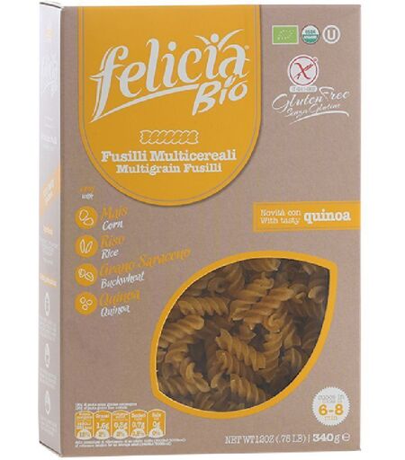 feliciaBio Pasta prodotta con 4 diversi cereali altamente digeribile, dall'alto valore nutrizionale senza glutine.Formato fusilli, tempo di cottura, 6 - 8 minuti. Ingredienti Farina di mais*; farina di riso*; farina di riso grano saraceno*; farina di riso quinoa*.* da agricoltura biologica. Formato Confezione da 340 g. Cod. 563 ...
