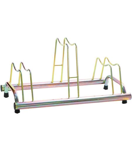 Portabici TERRA 3 POSTI DISC.Porta bici da terra 3 posti, in acciaio, zincato a freddo, color oro tropicale, con tappi in PVC nero, sistema di parcheggio bici superiore e basso per non far combaciare i manubri tra loro e permettere il perfetto post 3 bici.La curvatura superiore permette di ospitare anche biciclette con freno a disco.Dimensioni: 77 x 42 cm h 41 cm. ...
