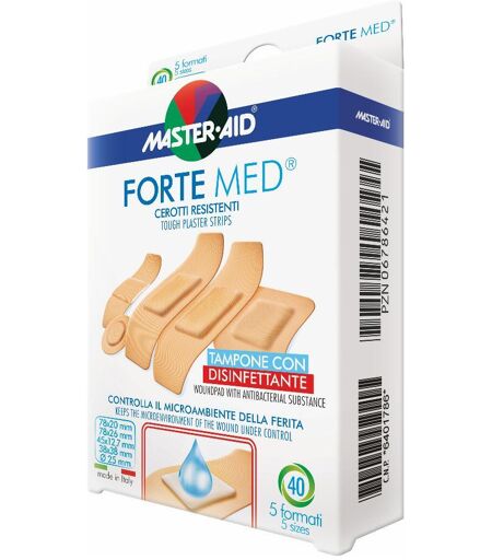 Master - Aid Forte Medicazione Cerotti Assortiti 40 Pezzi - Dispositivo medico CE 0373. Cerotti in striscia a protezione elevata. Tampone con disinfettante (clorexidina digluconato). FORTE med offre una elevata protezione della ferita dagli agenti esterni (sporcizia, batteri) grazie ad un supporto … ...