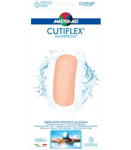 MASTER•AID CUTIFLEX ACQUA STOP - Dispositivo medico CE 0373. Medicazione in poliuretano, flessibile, elastica, sottilissima (20 micron) e trasparente che aderisce in modo ottimale (come una seconda pelle) e protegge la ferita anche in caso di immersione totale in acqua. CUTIFLEX protegge l… ...