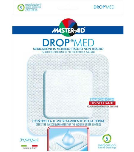 MASTER•AID - DROP MED - Medicazione traspirante in tessuto non tessuto, dotata di un tampone assorbente con sostanza disinfettante (clorexidina digluconato 0,5%). Collante ipoallergenico, privo di solventi e privo di lattice di gomma naturale. Supporto Morbido tessuto non tessuto. Perfetta conforma… ...