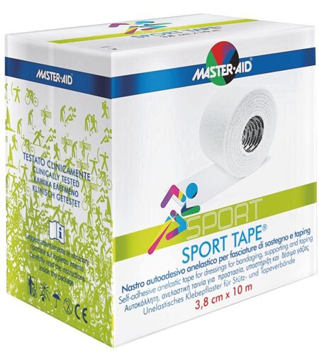 Master - Aid Sport Tape 3,8cm x 10m - Dispositivo medico CE, classe I non sterile. Nastro autoadesivo anelastico ad alta resistenza alla tensione per impieghi specifici. Specifico per il bendaggio di sostegno e di contenimento delle articolazioni anche nell'attività sportiva. Il corretto bendaggio … ...