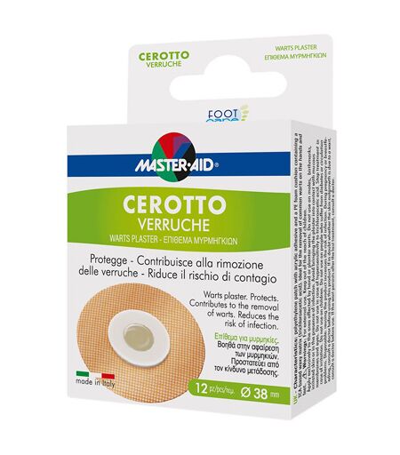 Master Aid Foot care Cerotto Verruche - Master Aid Foot care Cerotto Verruche è indicato per la rimozione tramite processo cheratolitico delle verruche plantari e palmari. Agisce in tre direzioni: - protegge grazie al dischetto in polietilene espanso la zona in cui è presente la verruca e riduce … ...