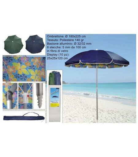 Ombrellone 100 cm in alluminio fantasia floreale Ombrellone da spiaggia in alluminio con fantasia floreale diametro 100cm x H 225 cm completo di sacca con tracolla per trasporto Tessuto 100% poliestere. 8 stecche in fibra di vetro: d. 5mmx100cm. Bastone: 32mm. 2 colori disponibili: interno fantasia floreale, esterno tinta unita blu o verde (seconda foto) Indicare nell'ordine il colore desiderato, se non disponibile verrà spedito in base alla disponibilità di magazzino. ...