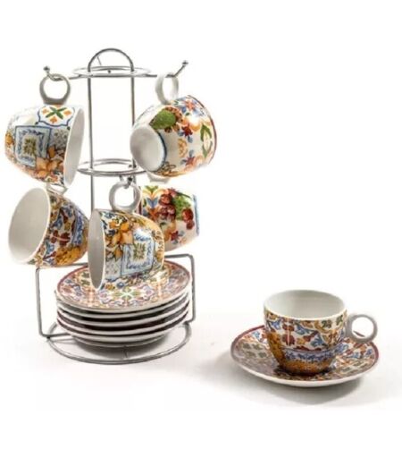 Mercury M home - set 6 tazzine in porcellana conpiattino e supporto in acciaio
