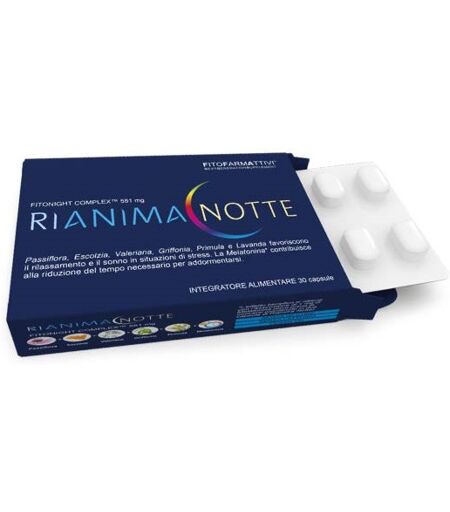 RIANIMA NOTTE - Descrizione Integratore alimentare a base di passiflora, primula, escolzia, valeriana, griffonia e lavanda, che favoriscono il rilassamento e il sonno in situazioni di stress. Con melatonina che contribuisce alla riduzione del tempo necessario per addormentarsi. L’effetto benefico s… ...