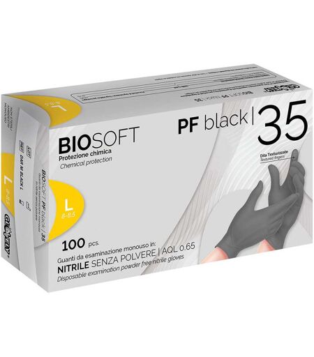 Guanti Monouso In Nitrile Nero, Privi Di Polvere Lubrificante, Internamente Clorinati, Colore Nero, Forma Anatomica Intercambiabile Destra E Sinistra (ambidestri) E Dita Testurizzate. I Polsini Hanno Un Bordino Elastico Anti-arrotolamento Che Rinforza L’estremità Del Guanto, Ne Aumenta La Vestibilità Ed Impedisce Alla Manichetta Di Arrotolarsi, E Sono Di Lunghezza Tale Da Consentirne L’aderenza Al Camice In Qualunque Posizione Della Mano. I Guanti Biosoft Pf Black 35 Sono Realizzati A Corpo Unico, Quindi Privi Di Saldature E Di Sbavature, Hanno Un’ottima Consistenza, Elasticità E Morbidezza Tali Da Garantire Una Perfetta Aderenza Ed Un’ottima