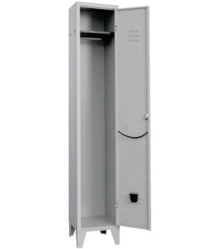 In lamiera di acciaio pressopiegata, con pretrattamento di fosfosgrassaggio e verniciatura a forno continuo. Colore grigio RAL 7035. Allestito con porta asciugamani, appendiabiti, ripiano interno, feritoie e portacartellino. Con serratura a cilindro con doppia chiave in dotazione. ...