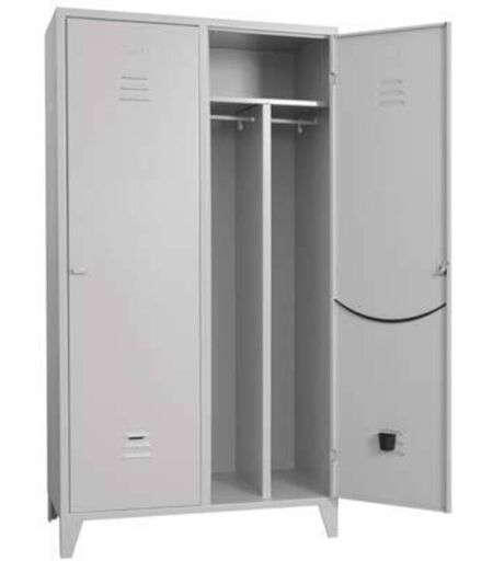 In lamiera di acciaio pressopiegata, con pretrattamento di fosfosgrassaggio e verniciatura a forno continuo. Colore grigio RAL 7035. Allestito con porta asciugamani, appendiabiti, ripiano interno, feritoie, portacartellino e paratia centrale. Con serratura a cilindro con doppia chiave in dotazione. ...