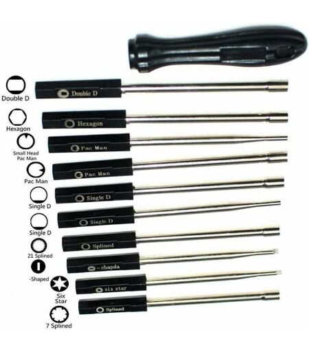 Kit di strumenti per la regolazione del carburatore per Stihl Husqvarna, Poulan, Jonsered, McCulloch, MTD, Ryobi, Homelite, Weed Eater, Echo, Makita, Dolmar, Honda, Solo, Oleo-Mac, Efco, Bolens, Troy-Bilt, Cub Cadet, Snapper, Enhell, Sears, Kawasaki, John Deere, Craftsman, Tanaka, ecc. piccoli motori Regolazione per carburatori Zama, Walbro, Ruixing, HuaYi, ecc. Regolazione per decespugliatore, motosega, soffiatore per foglie, tagliasiepi, bordatore, potatore, motocoltivatore, scopa, ecc. Confezione: 1 strumento per la regolazione del carburatore a 7 scanalature, 1 strumento per la regolazione del carburatore a 21 scanalature, 1 strumento per la regolazione del carburatore a sei stelle, 1 strumento per la regolazione del carburatore Pac Man, 1 testina piccola Strumento di regolazione Pac Man 1 x Strumento di regolazione esagonale 1 x Strumento di regolazione a doppia D 1 x Strumento di regolazione a D singola 1 x Strumento di regolazione a D singola con testa piccola 1 x Strumento di ...