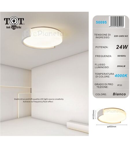 Plafoniera rotonda dal design moderno e minimal. Le linee pulite sono arricchite da un dettaglio semi circolare oro o bianco che accompagna il lampadario. Ideale per camera da letto, soggiorno, cucina, ufficio, bar e ristoranti. Caratteristiche tecniche Uso Interno Potenza 24W Flusso luminoso 2664lm Colore corpo disponibile Bianco - Oro Voltaggio AC220-240V Frequenza 50/60Hz Dimmerabile No Luce disponibile Bianca - Naturale Materiale Alluminio+PVC Dimensioni Diametro 450 mm Profondità 120 mm Tipologia : A Soffitto ...