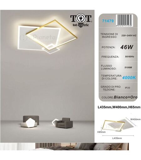 TOT ELECTRIC Plafoniera led 46w quadrato oro design moderno lampadario soffitto luce bianco naturale Naturale