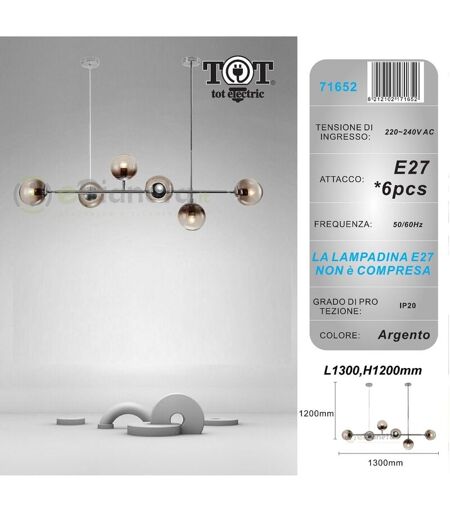 TOT ELECTRIC Lampadario sospensione bolle 6 sfere attacco E27 trasparenti in vetro lampada da soffitto in metallo oro argento moderno Argento
