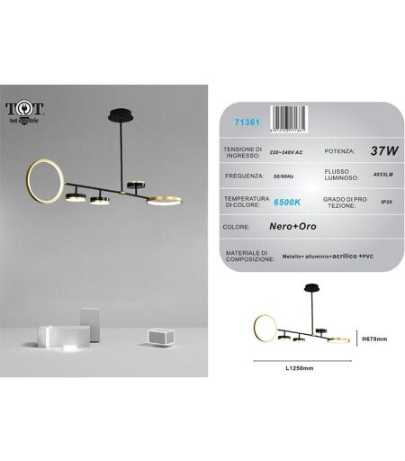Lampadario sospeso con illuminazione led dal design moderno e minimal. Struttura composta da 5 cerchi, distribuiti in modo orizzontale. Ideale per spazi di casa, negozi, uffici e locali dedicati al ristoro. Caratteristiche tecniche Potenza 37W Flusso luminoso 4033lm Colore corpo Nero e oro Voltaggio AC220-240V Frequenza 50/60Hz Dimmerabile No Uso Interno Luce disponibile 6500k bianca - 4000k naturale Materiale Metallo + Alluminio + Acrilico + PVC Dimensioni Larghezza 1250 mm Altezza 670 mm Tipologia : A sospensione ...