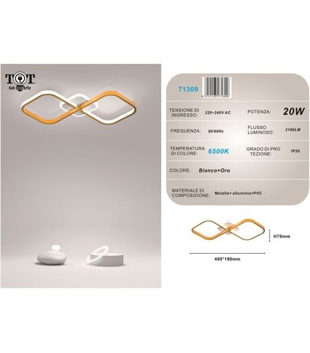 Plafoniera con illuminazione led dal design moderno e minimal. Struttura realizzato in alluminio dorato con effetto intrecciato. Base al soffitto bianco luminoso. Ideale per ambienti interni di casa, ristoranti, uffici, bar, locali commerciali, ecc. Installazione facile e veloce, poiché non necessita di montaggio. Caratteristiche tecniche Potenza 20W Flusso luminoso 2180lm Colore corpo Oro Voltaggio AC220-240V Frequenza 50/60Hz Dimmerabile No Uso Interno Luce disponibile 6500k bianca - 4000k naturale Materiale Alluminio + PVC Dimensioni Larghezza 400 mm Lunghezza 190 mm Spessore 70 mm Tipologia : A Soffitto ...