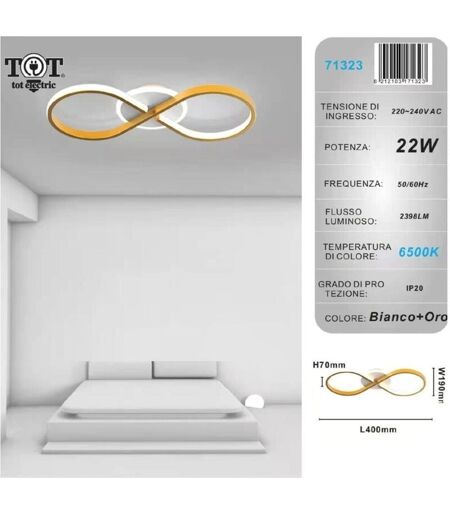 Plafoniera con illuminazione led dal design moderno e minimal. Struttura realizzato in alluminio dorato con effetto intrecciato. Base al soffitto bianco luminoso. Ideale per ambienti interni di casa, ristoranti, uffici, bar, locali commerciali, ecc. Installazione facile e veloce, poiché non necessita di montaggio. Caratteristiche tecniche Potenza 22W Flusso luminoso 2442lm Colore corpo Oro Voltaggio AC220-240V Frequenza 50/60Hz Dimmerabile No Uso Interno Luce disponibile 6500k bianca - 4000k naturale Materiale Alluminio + PVC Dimensioni Larghezza 400 mm Lunghezza 190 mm Spessore 70 mm Tipologia : A Soffitto ...