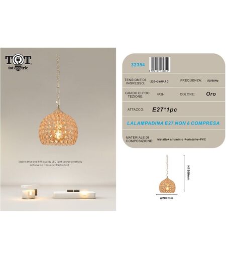 TOT ELECTRIC Lampadario sospeso tondo cupola con cristalli lampada mezza sfera luce led attacco E27 oro argento per camera cucina soggiorno 200 mm - Oro