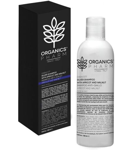 ORGANICS P H A R M - SILVER SHAMPOO WITH APRICOT AND WALNUT - Descrizione Lo shampoo anti - giallo è ideale per capelli grigi bianchi e decolorati. Ravviva le mèches neutralizzando i toni gialli e rendendo più luminosi e brillanti i capelli chiari. Gli estratti naturali di noce ed albicocca uniti… ...