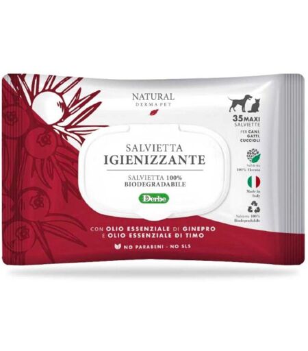 Derbe Salviette Funzionali Igienizzanti Biodegradabili per Cani Gatti e Cuccioli Natural Derma Pet.Salviette specifiche igienizzanti con Ginepro e Timo.Salvietta dall’elevato potere detergente, formulata con purissimi oli essenziali di timo e ginepro, in grado di svolgere un’azione efficace di pulizia profonda del manto liberandolo dalle dannose particelle di polvere e dai residui dell’inquinamento cittadino.Le sue virtù astringenti aiutano a riequilibrare il pH del manto e si rendono utili anche nel dare sollievo alla cute particolarmente soggetta ad essere sensibilizzata da agenti esterni.Una delle proprietà principali della pianta di Ginepro è quella di essere un potente detossinante. Unita al forte potere antisettico e antiparassitario, fa del Ginepro una pianta molto importante per igienizzare il manto.L’olio essenziale di timo, distillato in corrente di vapore dalle foglie e dalle sommità fiorite, ha qualità stimolanti, antibatteriche ed espettoranti.NON CONTIENE PARABENI - NO SLSOgni confezione contiene 35 salviettine maxi. ...