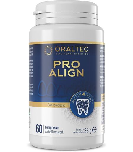 ORALTEC - PRO ALIGN - Descrizione Integratore alimentare in compresse a base di vitamine e minerali, con vitamina C che contribuisce alla normale formazione del collagene per la normale funzione delle ossa, delle cartilagini, delle gengive e dei denti. Contiene il complesso NUTRI4DENT, uno speciale… ...