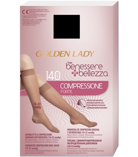GOLDEN LADY - linea benessere+bellezza COMPRESSIONE FORTE - Descrizione Dispositivo medico di classe I conforme alla direttiva europea 93/42 CEE. Gambaletto 140 denari a compressione graduata differenziata (18 - 22 mmHg) con elegante bordino ricamato. Punta e tallone rinforzati ed anatomici. Stimol… ...