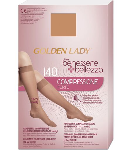 GOLDEN LADY - linea benessere+bellezza COMPRESSIONE FORTE - Descrizione Dispositivo medico di classe I conforme alla direttiva europea 93/42 CEE. Gambaletto 140 denari a compressione graduata differenziata (18 - 22 mmHg) con elegante bordino ricamato. Punta e tallone rinforzati ed anatomici. Stimol… ...