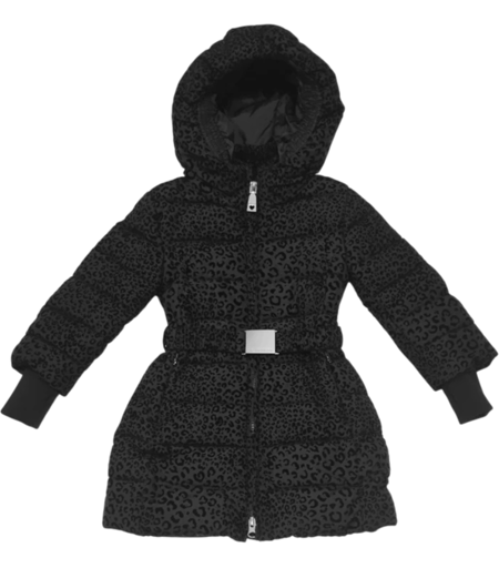 Piumino nero maculato; leggermente lungo; sfiancato con cinta in vita. ...