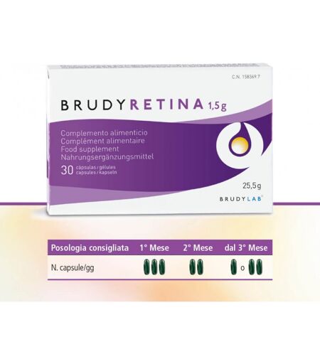 BRUDYRETINA - Descrizione Integratore alimentare di acidi grassi omega 3 sotto forma di trigliceride (DHA 70%, EPA 8,5%, DPA 6%), vitamine (B1, B2, B3, B6, B9, B12, C, E), luteina, zeaxantina e minerali (selenio, manganese, zinco, rame). Ingredienti Olio di pesce concentrato negli acidi grassi omeg… ...