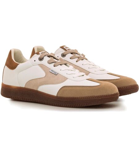 Sneakers retro da uomo in bianco, modello Nova di mtng.Combina inserti con finitura tipo suede sulla punta, sul lato e sul tallone, offrendo texture e contrasto visivo grazie ai toni cammello e crema.La suola in gomma color caramello rafforza il carattere classico del modello, mentre il numero 1967 sul tallone si riferisce all´origine del marchio.Ideali per look casual con un tocco nostalgico.Con certificato VEGAN sigillato da INESCOP, che garantisce che la principale natura chimica del materiale non corrisponde a fibre di origine animale. ...