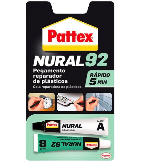 Pattex nural 92 22ml colla per riparazioni plastiche. adesivo rapido e traslucido ad alta resistenza, speciale per l'incollaggio e la riparazione della maggior parte delle plastiche. tempo di miscelazione 2 minuti, tempo di manipolazione 10 minuti. colore traslucido. aderisce a pvc, abs, metacrilato, formica, bachelite, poliuretano espanso, polistirene, skay, nylon, gomma e tessuti plastificati. ...