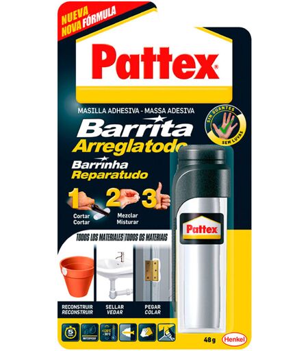 Pattex 48g stucco bicomponente extra forte. ripristina, ricostruisce, sigilla, incolla, riempie e fissa tutti i tipi di materiali in casa. si impasta come plastilina, indurisce come pietra. si applica in 3 minuti, indurisce in 5 minuti, funziona anche sott'acqua, può essere carteggiato, forato, lavorato, verniciato o levigato. ideale per pietra, mattone, intonaco, ceramica, legno, acciaio, alluminio, pvc, vetro, plastica, sughero e specchi. ...