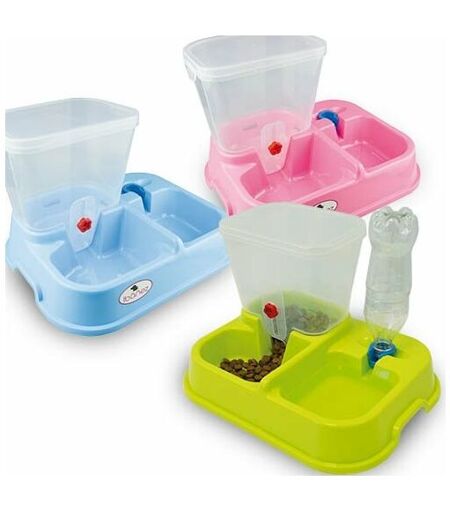 Distributore di acqua e cibo per cani e gatti Ibáñez. disporre di un' alimentazione continua di acqua e di mangimi nello stesso recipiente. L'alimento viene aggiunto ad un serbatoio in plastica trasparente con un piccolo coperchio scorrevole in plastica sul fondo che permette al cibo di uscire. È possibile utilizzare qualsiasi bottiglia con un cacciavite universal (bottiglia non inclusa). Alcune bottiglie d'acqua hanno il filo più largo e non si adattano, le più adatte sono quelle di bibite analcoliche (Coca Cola, Kas,...) Questo dispenser è perfetto per quando si deve essere lontani da casa tutto il giorno , o se si hanno più di un animale domestico . Non dovrete quindi preoccuparvi della mancanza di acqua o di mangime fresco. Nella parte superior del contenitore dei mangimi è presente un coperchio in plastica per un facile riempimento . Capacità erogatore 1,5 kg . 3 colori disponibili: rosa, verde e blu . Se si desidera un colore particolare, è possibile specificarlo quando si ...
