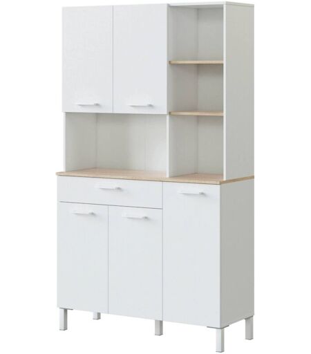 ARMADIO MULTIUSO LAREDO - Mobile ausiliario da cucina, Credenza a 5 ante e 1 cassetto con ripiani, Armadio aperto, cm 108x40h186, Bianco e Rovere. STRUTTURA E UTILIZZO - Armadio ausiliario a parete a cinque ante battenti e un cassetto con nicchia, all'interno un ripiano non regolabile: l'organizzazione della struttura permette di sfruttare al meglio lo spazio - A seconda delle esigenze della casa e alle sue funzioni, questa dispensa contenitore è perfetta per arredare ripostiglio, lavanderia, bagno, cucina, corridoio o ingresso contenendo dai prodotti per la pulizia alle stoviglie. FORNITO DI KIT DI MONTAGGIO - Questo complemento d'arredo salvaspazio viene fornito smontato con allegato un semplice libretto di istruzioni al montaggio che vi permetterà un assemblaggio semplice e veloce - L'imballaggio è accurato e adeguato al mobile, in modo da preservare l'articolo d'arredamento di design durante il trasporto. CARATTERISTICHE TECNICHE - Prodotto composto in legno laminato con spessore ...