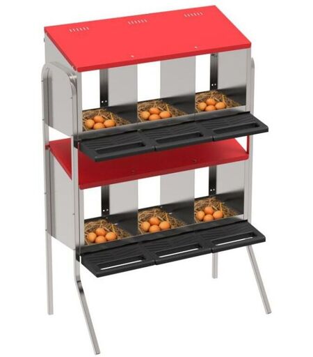 Nido con zampe per polli con nuovo vassoio in plastica facile da rimuovere per una migliore pulizia e disinfezione. Il nuovo vassoio ha le gambe in modo che possa essere posizionato su qualsiasi superficie senza doverlo avvitare al muro, quindi ne agevoliamo la mobilità nel recinto assicurandone il perfetto funzionamento. Il tetto ha delle aperture per evitare la condensa all'interno del nido. Modello con misure 56x47x123 cm. ...