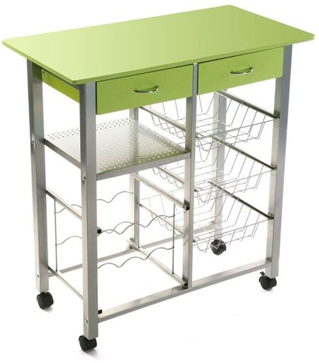 VERSA Carrello da Cucina in Legno e Acciaio Piano di Lavoro verde 76x40 2 Cassetti 3 Cestini Porta Frutta Verdure Cantinetta 6 porta bottiglie e 4 Ruote