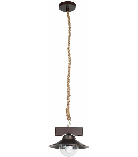 Sospensione dal design rustico in metallo e vetro. 1 lampadina E27 max 15W NON INCLUSA IP: 20 Lunghezza cavo elettrico 100 cm Dimensioni: Diametro 24 cm, H 112 cm ...