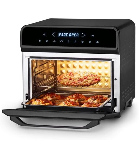 Friggitrice ad aria senza olio con 1800 W di potenza e tecnologia di circolazione dell'aria ad alta velocità a 360º, che consente di cucinare senza bisogno di oli aggiunti, rendendo i piatti meno calorici e più sani. 8 programmi: Patatine fritte, ali di pollo, pesce, bistecca, pizza, pesce, forno e disidratazione, oltre all'opzione rosticceria. Capacità XXL di 23 L per cucinare facilmente grandi quantità di piatti. Facile e comoda da usare grazie al controllo digitale del tempo e della temperatura. Timer fino a 60 minuti e controllo della temperatura fino a 230ºC. È sufficiente impostare la temperatura e l'ora desiderate e la friggitrice si spegnerà automaticamente allo scadere del tempo impostato. In alternativa, è possibile selezionare il programma desiderato direttamente dal menu, a seconda di ciò che si voglia cucinare. 6 accessori inclusi: 4 teglie, pinze di estrazione e ganci per arrosti. Dispone inoltre di una luce interna che consente di vedere in ogni momento lo stato di ...