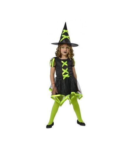 Vestiti come una strega per la notte di Halloween con questo accattivante vestito. Si compone di un bellissimo abito che combina diverse texture in nero e verde come le maniche a sbuffo con finitura a rete, la gonna a strati di tulle o il dettaglio della forma intrecciata del petto con nastro verde. Infine, porta il cappello da strega, che, avendo la stessa finitura, ha un aspetto fantastico. ...