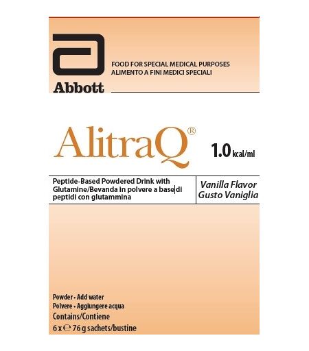 AlitraQ - Descrizione Alimento a fini medici speciali. Indicato per la gestione dietetica delle patologie legate allo stress metabolico con compromissione della funzione gastrointestinale per i pazienti che richiedono una formula a base di peptidi, ad alto contenuto proteico e basso residuo con glu… ...