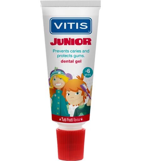 VITIS JUNIOR DENTAL GEL TUTTI FRUTTI - Descrizione Il dentifricio quotidiano Vitis Junior Gel, dal sapore Tutti Frutti, è stato formulato appositamente per l'igiene orale in questa fase speciale, in cui inizia lo sviluppo della dentizione adulta. La sua formulazione con fluoro, xilitolo e pantenolo… ...