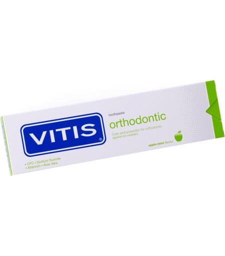 VITIS orthodontic dentifricio - La sua formulazione rinforza lo smalto dei denti, riduce la formazione del biofilm e mantiene sane le gengive. L'uso quotidiano permette di avere una bocca pulita e sana nel corso del trattamento ortodontico. Ha un gradevole gusto di mela/menta. Inoltre, la consisten… ...