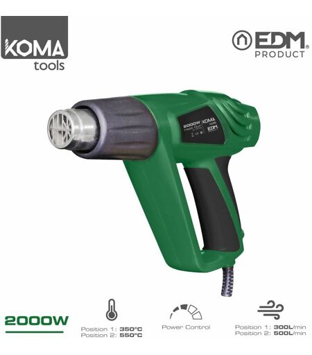 Sverniciatore elettrico. potenza: 2000w. impugnatura ergonomica soft touch. cavo da 2 m. 2 posizioni di temperatura e flusso d'aria: (posizione 1: 350ºc e 300 l/min. posizione 2: 550ºc e 500 l/min). accessori: 4 ugelli. dimensioni: 26,5x20,6cm (profondità/altezza) 230/240v 50hz koma tools ...