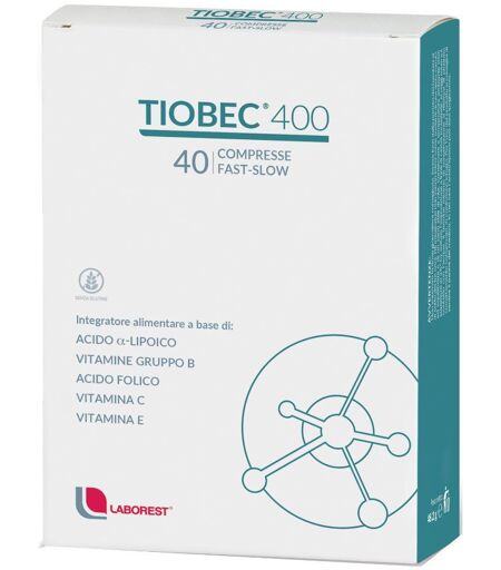 Tiobec 400 - COMPRESSE FAST - SLOW - Senza Glutine Integratore alimentare a base di Acido a - lipoico (acido tiottico), Vitamine del gruppo B, Vitamina E e Vitamina C. La Vitamina C contribuisce al normale metabolismo energetico. Le Vitamine C ed E proteggono le cellule dallo stress ossidativo, men… ...