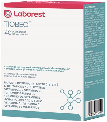Laborest TIOBEC - Descrizione Integratore alimentare a base di N - acetilcisteina, L - glutatione, vitamina D3, vitamine del gruppo B, vitamina E e vitamina C, utile in caso di aumentato fabbisogno di queste sostanze. Le vitamine C ed E favoriscono la protezione delle cellule dallo stress ossidativ… ...