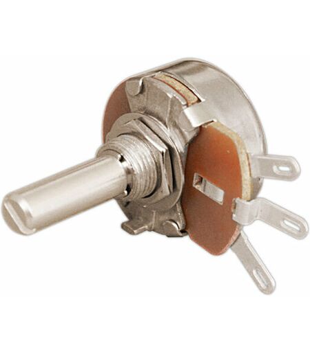 Potenziometro. Variazione della resistenza solo lineare. Tensione applicabile tra i terminali e la scatola metallica: 1000 VAC per un minuto. 500 VDC. in funzionamento continuo Interruttore: Non può essere montato. Caratteristiche Resistenza 5 KΩ Potenza nominale 5W a 25º, 4W a 55ºC Alloggiamento metallo Angolo di rotazione 300 gradi circa. Tolleranza ±5% Numero di scatti intermedi nessuno Diametro di base 24 mm Asse diametro 6 mm lunghezza 20 mm materiale alluminio Fissaggio filettato diametro 9'52 mm (3/8") lunghezza 6,5 mm (inclusi dado e rondella) Tipo di fissaggio per filo ...