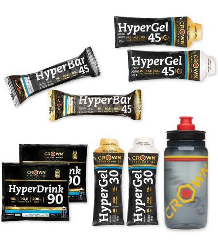 Nuovo.PACK Hyper Energy Tester., ideale per testare tutti i prodotti della linea Hyper (1:0.8) e per raggiungere con facilità elevate quantità di carboidrati all`ora.Puoi sceglierlo con una bottiglia PRO Fly da 550ml o 750ml.Composto da:2 Bustine di HyperDrink 90 (Gusto Neutro):Bevanda in polvere con la miscela ideale, secondo la scienza, di carboidrati, Maltodestrine e Fruttosio, in rapporto di.1,25:1 (comunemente 1:0,8).In un`unica assunzione da 500 ml avrai 90 g di carboidrati più un apporto extra di Sodio (ca.208mg).2 bustine di HyperGel 30 (1 x con caffeina e 1 x senza):Gel energetico acquoso con.30 g di carboidrati.Più acqua e sodio extra.Di altissima qualità e con una composizione ideale di carboidrati e sodio, nutrienti necessari per migliorare le prestazioni sia in allenamento che in competizioni di lunga durata e/o ad alta intensità.2 bustine di HyperGel 45 (1 x con caffeina e 1 x senza):Gel energetico acquoso con.45 g di carboidrati.Più acqua e sodio extra.Di altissima qualità e con una composizione ideale di carboidrati e sodio, nutrienti necessari per migliorare le prestazioni sia in allenamento che in competizioni di lunga durata e/o ad alta intensità.2 barrette HyperBar 45 doppie (1 x con caffeina e 1 x senza):Questo è l`adattamento in formato gommoso del nostro HyperGel 45.È un.Doppia barretta da 60 g (2x30 g per confezione).Di altissima qualità e con una composizione ideale di carboidrati e sodio, nutrienti necessari per migliorare le prestazioni sia in allenamento che in gare di lunga durata.1 flacone PRO Fly da 550 ml o 750 ml.Per idratarti durante le tue sessioni in modo semplice e ottimale.La borraccia PRO Fly è quella utilizzata dai pro dell`UCI World Tour, con un beccuccio che permette un getto fluido e abbondante e plastica molto facile da spremere.Sommario 8 prodotti:2 HyperDrink 90.1 x HyperGel 30 Hydro.1 x HyperGel 30 + Caffeina Hydro.1 x Hypergel 45.1 x HyperGel 45 + Caffeina.1 HyperBar 45.1 x HyperBar 45 + Caffeina.1 tanica PRO Fly da 550 ml, 750 ml. ...